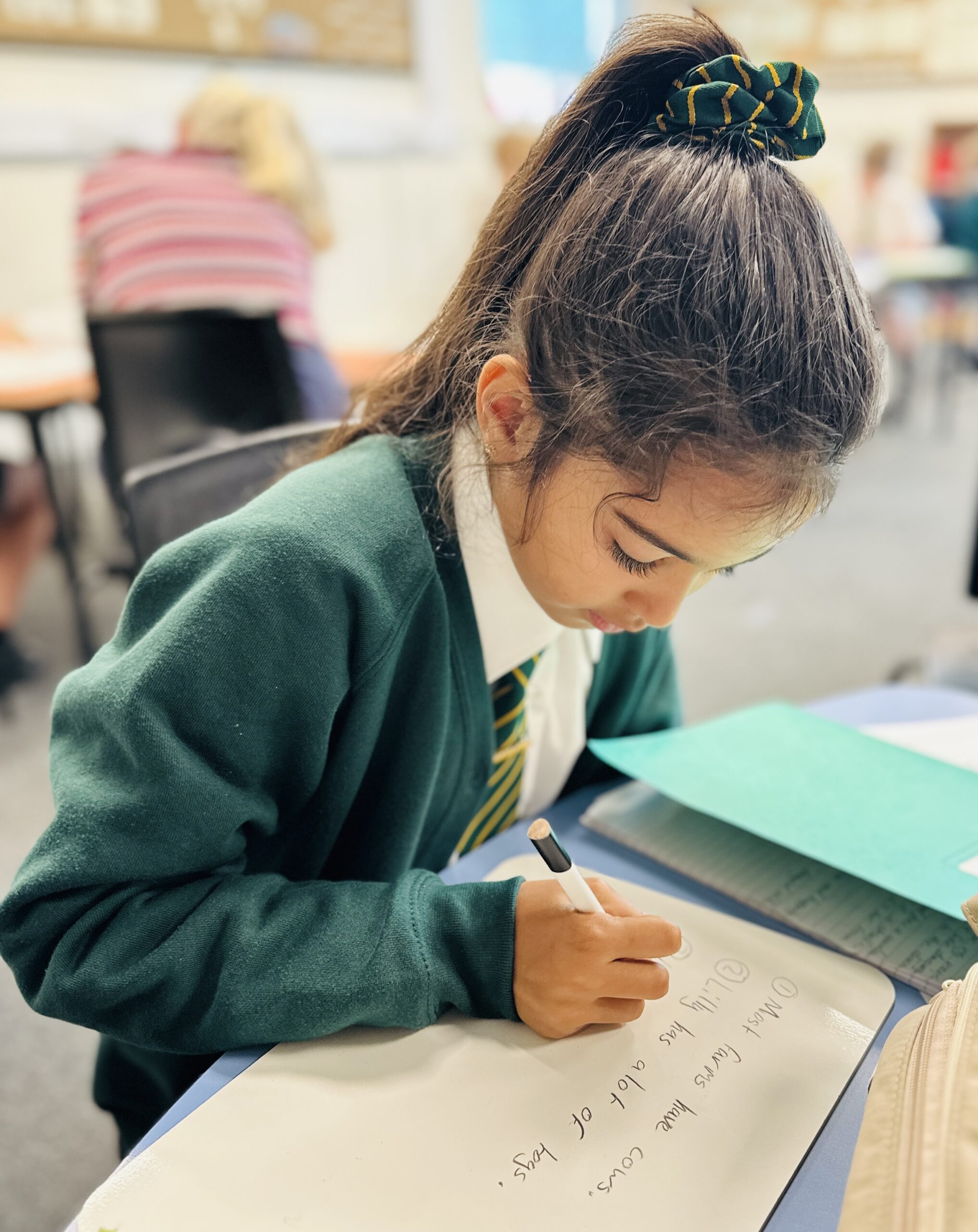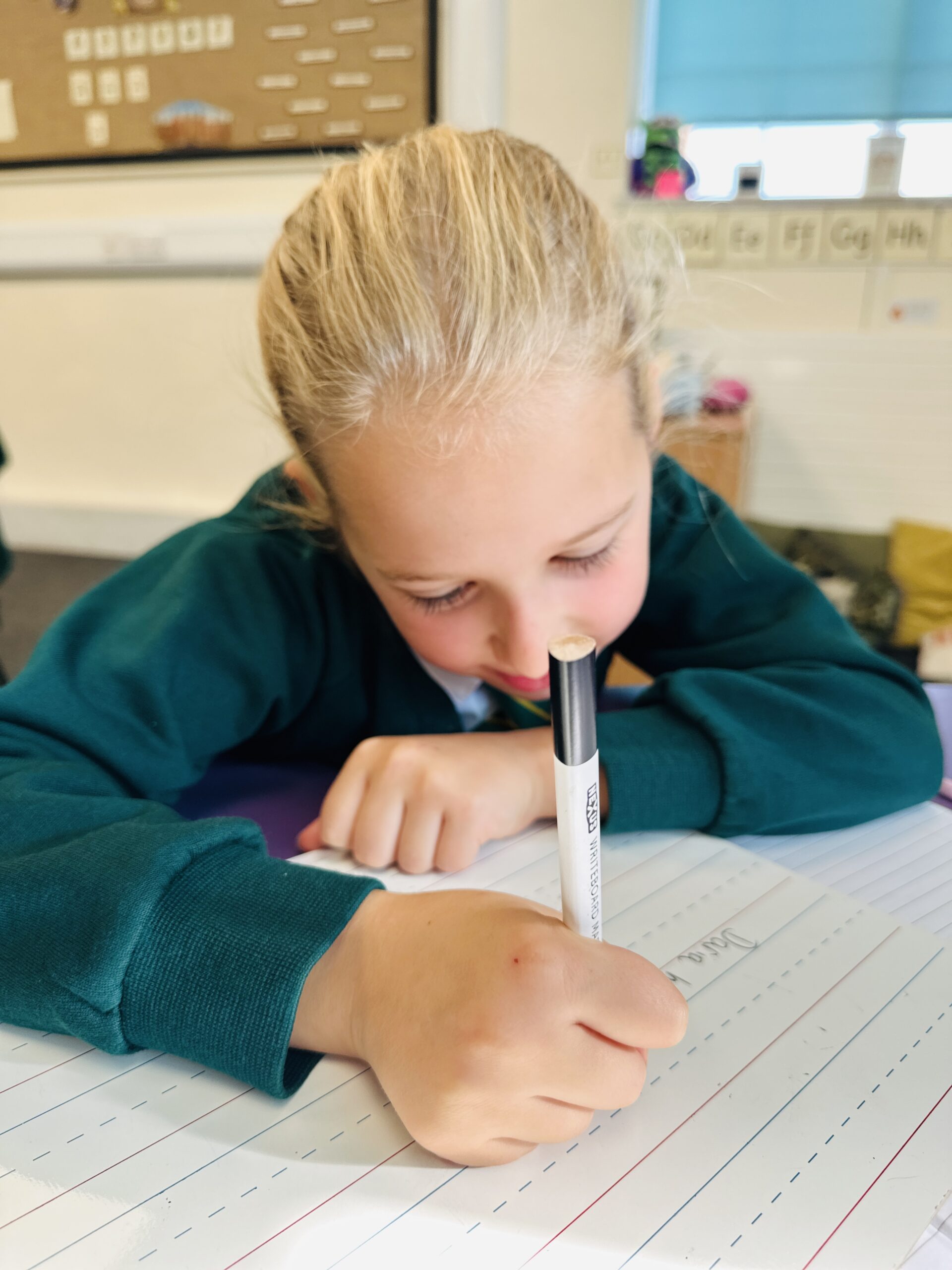 In Year 1, conditions are clearly set and created for good writing, as well as continuing to develop fine motor skills and hand-eye coordination. All of the lower-case and capital letters are covered with clear and consistent instructions about how to start and finish letters and the digits 0-9 are clearly taught.